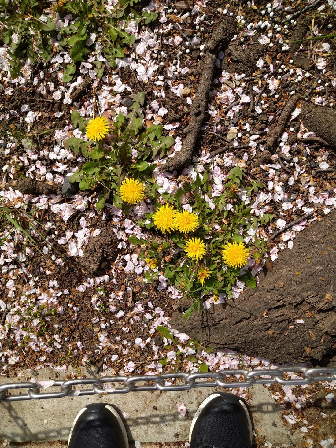 みんなが見上げる満開の桜の下に咲いていた蒲公英