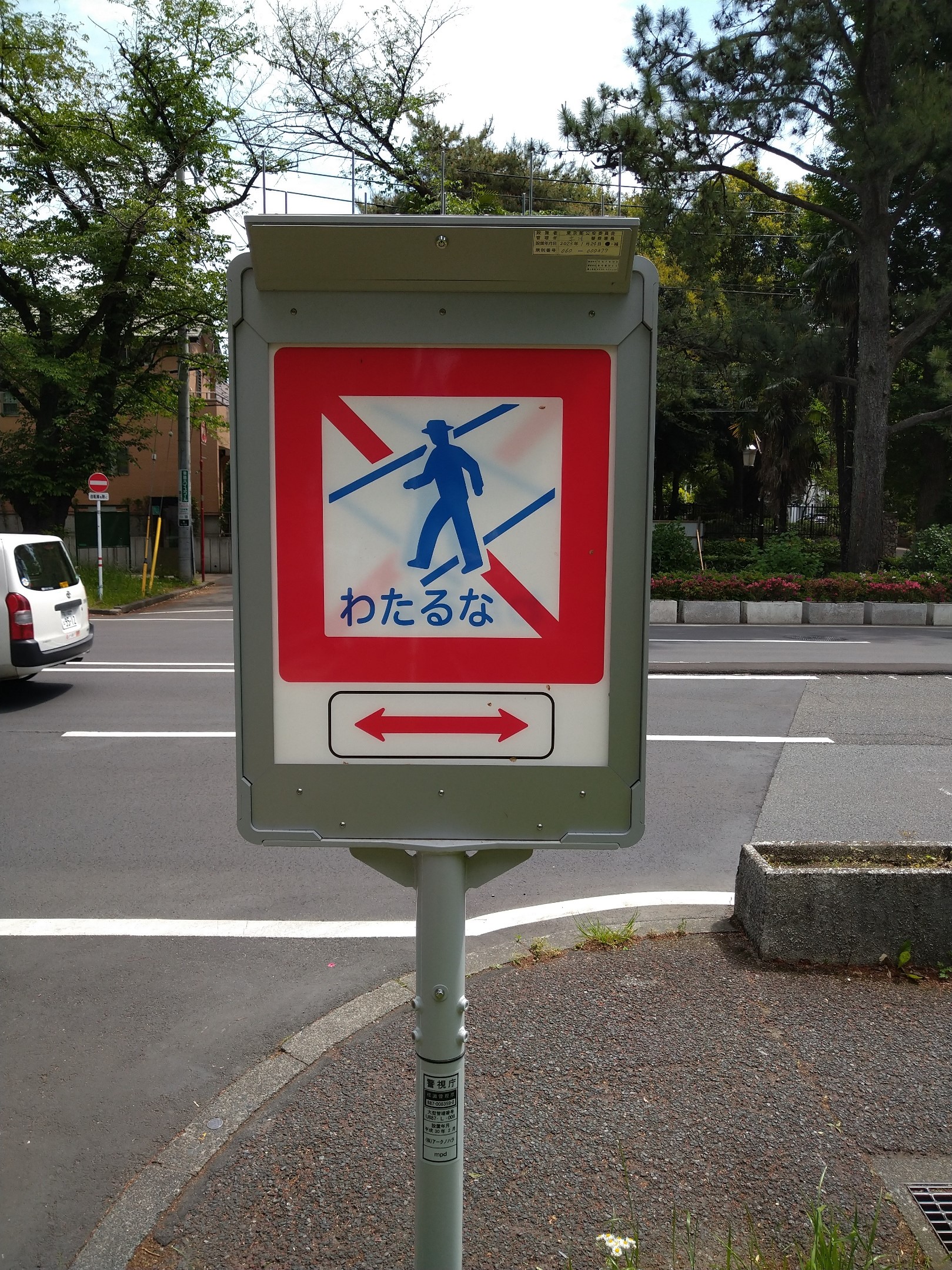 「わたるな」の交通標識。